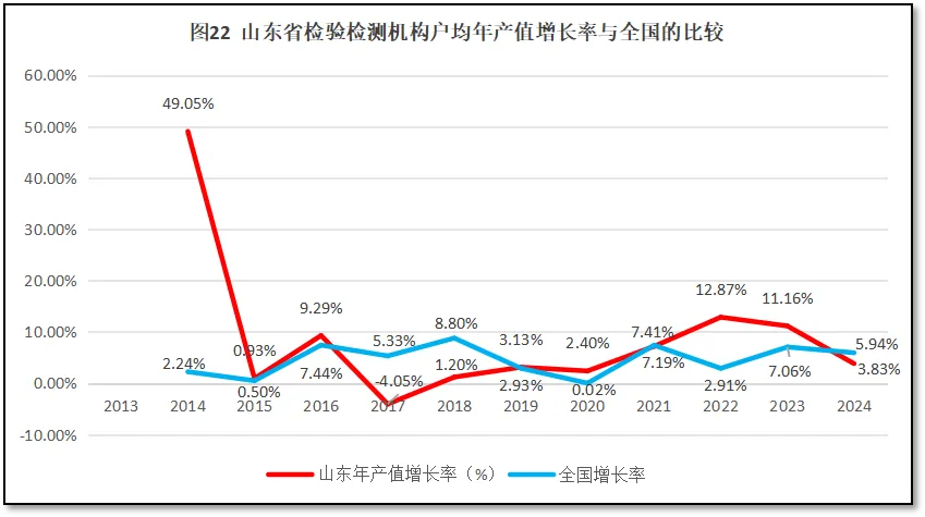 由图19可见,山东省与全国检验检测机构人均年产值增长率的变化规律有不小差异。在2018年之前,山东省检验检测机构人均年产值的增长率波动十分剧烈,隔年大起大落。在2018-2023年总体保持持续上升的趋势,2024年又出现比较显著的下滑。这说明,2024年山东省检验检测行业受宏观经济下行等客观因素影响较为严重,叠加行业内本来就存在的机构过多、低价竞争、激励措施少等问题,进一步压缩了检验检测机构的发展空间。