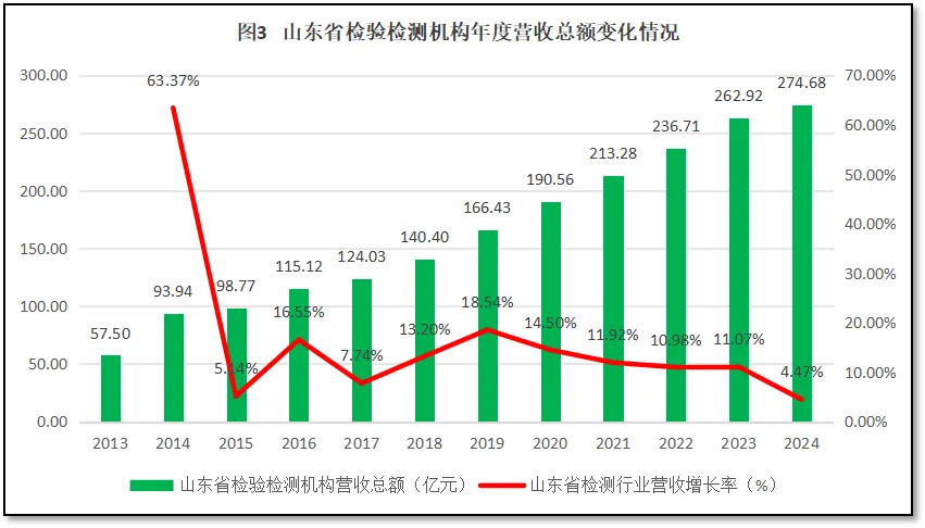 由图3可见,过去12年,山东省检验检测机构年度营收增长很快,2024年末的行业年度营收总额达到274.68亿元,是2013年的4.78倍,年均增速达到16.14%。从增长率来看,除了2014年和2015年因统计数据质量不高导致曲线波动巨大之外,山东省检验检测机构营收总额基本保持在高位波动,2016年以来年均增速保持在12.1%左右。2019年之后,山东省检验检测机构年度营收总额的增长率逐步减缓,持续下降,到2024年度降到4.47%,是历年来最低的一次。