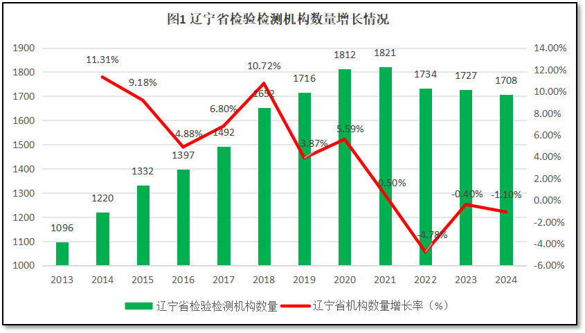 由图1可见,过去12年,浙江省检验检测机构数量总体保持先增长后平稳的发展特点,2021年之前持续增长,2021年之后各年机构数量略有起伏,总体平稳。2024年末,浙江省的检验检测机构数是2275家,是2013年末的2.03倍,年均增速为6.98%。但2024年度浙江省检验检测机构数量较2023年末净减少179家,刨除可能存在的统计误差,显示出2024年浙江省检验检测行业加快了“挤出”效应,淘汰了不少无法应对市场竞争的机构。从年度增长率曲线来看,浙江省检验检测机构数量除了在头两年统计数据质量不高的时候显得增速很大之外,从2015年起增幅相对平稳,逐步走低,最近10年的年均增速为4.72%,2024年度的增长率为-7.29%,为历年最低。
